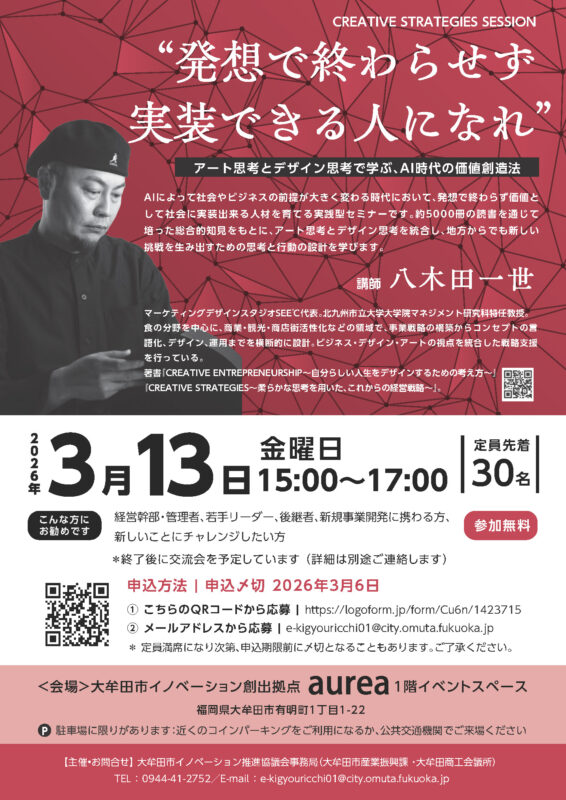この度、大牟田市イノベーション創出拠点「aurea」にて、 アート思考とデザイン思考を統合し、地方から新しい挑戦を生み出すための実践型セミナー 『CREATIVE STRATEGIES SESSION』を開催いたします。