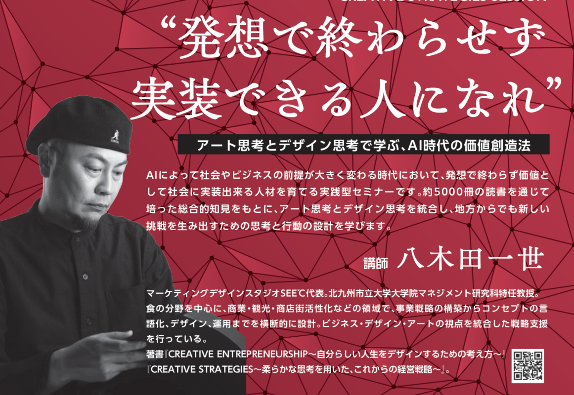講師には、約5,000冊の読書から培った知見を持ち、 ビジネス・デザイン・アートを横断する戦略支援を行う八木田一世氏をお招きします。